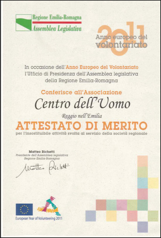 Anlässlich des Europäischen Jahres des Ehrenamtes 2011 überreichte der Präsident der gesetzgebenden Versammlung der Region Emilia-Romagna, Matteo Richetti, die Urkunde ATTESTO DI MERITO an die Organisation Zentrum des Menschen "in Anerkennung der unschätzbaren Aktivitäten, die es im Rahmen der ehrenamtlichen Tätigkeiten durchführt und für die Werte, die die Organisation ausdrückt und vertritt. "