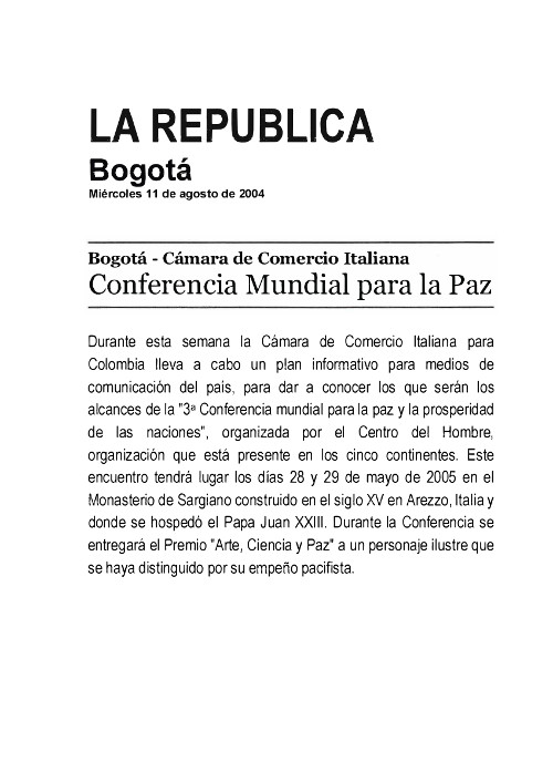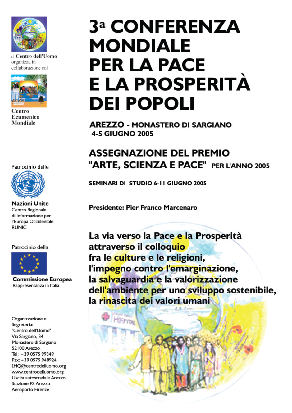 Der Weg zum Frieden durch den Dialog zwischen Kulturen und Religionen, der Kampf gegen die soziale Ausgrenzung, die Bewahrung und Wertschätzung der Umwelt für nachhaltige Entwicklung und die Wiedergeburt menschlicher Werte waren die Themen der "Dritten Weltkonferenz für den Frieden und Wohlstand der Völker" , die vom 4. bis 11. Juni 2005 in Arezzo im historischen Kloster von Sargiano unter der Schirmherrschaft der Vereinten Nationen und der Europäischen Kommission stattfand.
